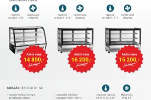Výprodejové ceny na chladicí prosklené skříně, stolní vitríny, mrázáky, chladicí obslužné vitríny, opékače párků, varných kotlů, plynových sporáků a elektrických pánví.
