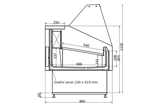 energeticky úsporné LED osvětlení (typ „maso“), chlazený úložný prostor z hliníkového plechu, hliníkové profily – stříbrné nebo zlaté, ekologická izolace z PU pěny, noční kryty, vnitřní elektronický teploměr, elektronický digitální termostat s displejem, automatické odtávání, odtok kondenzátu do vaničky, vnější korpus lakován práškovou bílou barvou, bočnice z plastu (tloušťka 45 mm) – bočnice barva šedá nebo hnědá, stavitelné nožičky