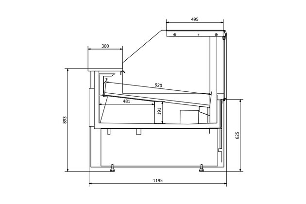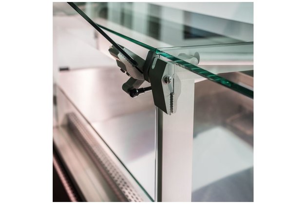 výstavní plocha nerezová hloubka 920 mm, teleskopický systém zvedání skel, energeticky úsporné LED osvětlení (typ „maso“), výstavní police nerezová, žulová pracovní plocha, vnější korpus práškově lakovaný, ekologická PU izolace, bočnice plechové tloušťky 50 mm s PU izolací, elektronický digitální termostat s displejem, vnitřní elektronický teploměr, automatické odtávání, odtok kondenzátu do sběrné vaničky, všechna skla bezpečnostní tvrzená, nožky stavitelné