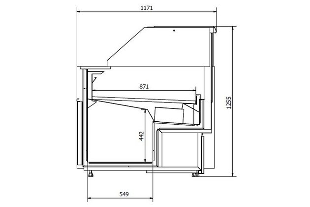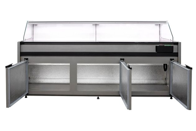 velký úložný prostor, teleskopický systém zvedání skel, energeticky úsporné LED osvětlení, výstavní plocha - nerezová , pracovní plocha žulová, vnější korpus (stříkaný práškovou barvou), ekologická PU izolace, bočnice kovové (tloušťka 50 mm), elektronický digitální termostat, vnitřní elektronický teploměr, odtok kondenzátu do sběrné vaničky, stavitelné nožičky, všechna skla bezpečnostní tvrzená, automatické odtávání