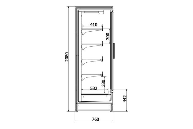 Hloubka:  760 mm, noční manuální roleta u otevřené verze, křídlové (samozavírací) nebo posuvné dveře, vnitřní část a police vyrobeny z pozinkované plechu (chráněného práškovým nástřikem), bočnice plné (izolované) tloušťka 40 mm,  ekologická PU izolace, odtok kondenzátu do kanalizace, vnitřní osvětlení – LED úsporné, automatické odtávání, lakovaná nástavba, elektronický digitální termostat s displejem, regulovatelné nožky, výstavní police s nastavením výšky a úhlu zavěšení, cenovkové lišty.