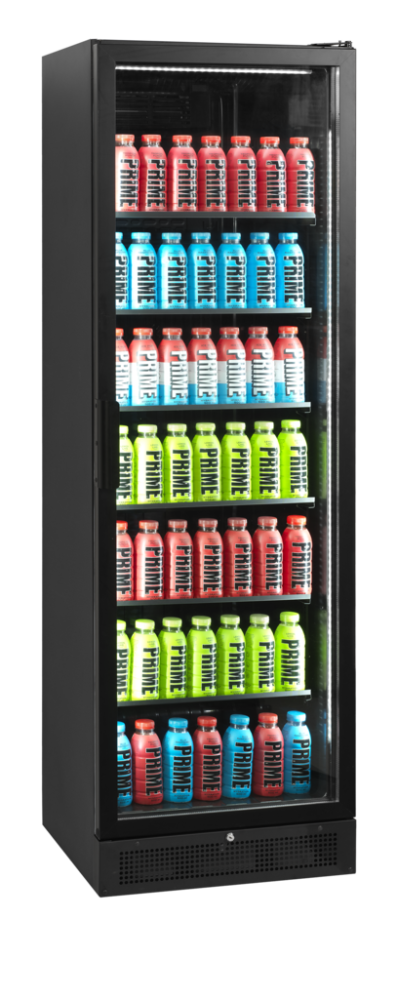 Chladicí prosklená skříň TEFCOLD SCU 1425 H v černé barvě je skvělá volba pro vystavení zboží k prodeji. Vnitřní LED osvětlení je zasazeno do rámu dveří a osvětluje produkty zepředu (jeden svislý pruh na každé straně a jeden vodorovný přes horní stranu). Černý exteriér zvyšuje kontrast mezi chlaničkou a osvětlenými produkty uvnitř, díky čemuž vystavené zboží vyniká a přitahuje pozornost. Chlazení s pomocným ventilátorem zajišťuje rovnoměrné chlazení v prostoru celé skříně.