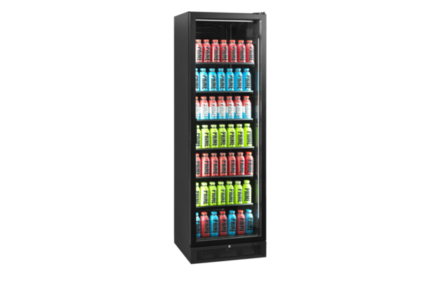 Chladicí prosklená skříň TEFCOLD SCU 1425 H v černé barvě je skvělá volba pro vystavení zboží k prodeji. Vnitřní LED osvětlení je zasazeno do rámu dveří a osvětluje produkty zepředu (jeden svislý pruh na každé straně a jeden vodorovný přes horní stranu). Černý exteriér zvyšuje kontrast mezi chlaničkou a osvětlenými produkty uvnitř, díky čemuž vystavené zboží vyniká a přitahuje pozornost. Chlazení s pomocným ventilátorem zajišťuje rovnoměrné chlazení v prostoru celé skříně.