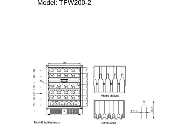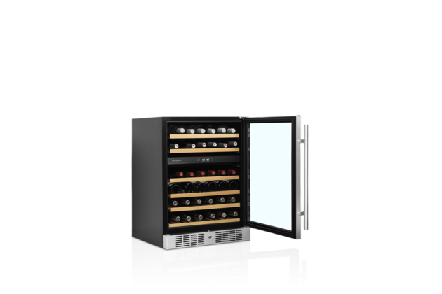 Vinotéky řady TFW-2S s prvky z nerezové oceli nabízejí moderní řešení pro vystavování a skladování lahví s vínem. Mají elegantní design s nerezovým rámem dveří a spodním čelním panelem, černými vnějšími boky a černým interiérem, jemné LED osvětlení a výsuvné dřevěné police. Vinotéka je vybavena moderním chladicím systémem, který umožňuje nastavení dvou rozdílných teplot. Agregát disponuje nízkou hlučností a spotřebou elektrické energie. Tento model má dvě teplotní zóny, které lze nastavit s maximální odchylkou 7 °C – můžete tedy v jedné zóně skladovat např. bílé víno při 9 °C a ve druhé červené víno při 16 °C.