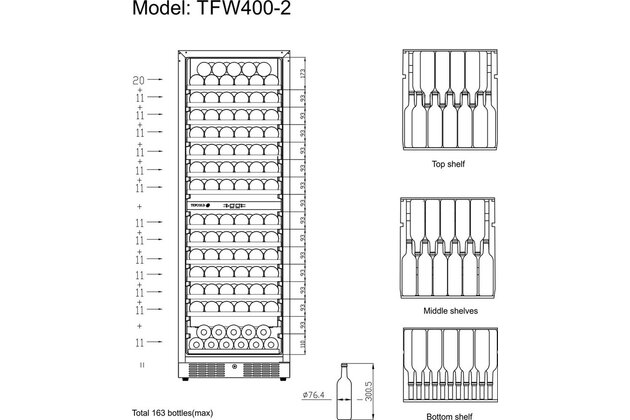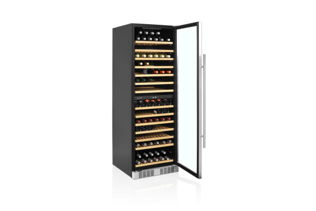 Vinotéky řady TFW-2S s prvky z nerezové oceli nabízejí moderní řešení pro vystavování a skladování lahví s vínem. Mají elegantní design s nerezovým rámem dveří a spodním čelním panelem, černými vnějšími boky a černým interiérem, jemné LED osvětlení a výsuvné dřevěné police. Vinotéka je vybavena moderním chladicím systémem, který umožňuje nastavení dvou rozdílných teplot. Agregát disponuje nízkou hlučností a spotřebou elektrické energie. Tento model má dvě teplotní zóny, které lze nastavit s maximální odchylkou 10 °C – můžete tedy v jedné zóně skladovat např. bílé víno při 7 °C a ve druhé červené víno při 17 °C.